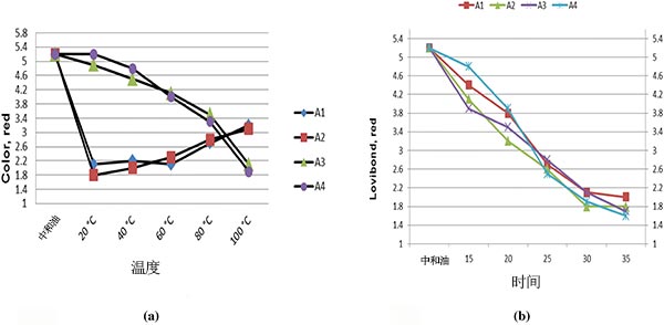 溫度對活性炭漂白過程的影響如圖2a所示。漂白過程在30分鐘內(nèi)進行,使用1%A1和A2以及1.5%A3和A4,溫度范圍為20至100℃。使用A4,以1.5%獲得使用1%樣品A2漂白獲得的結(jié)果。因此,在溫度圖表中,將1.5%的A3和A4與1%的A1和A2進行比較。使用1%的A4時獲得紅色值2.6。漂白溫度通常為90至125℃。因為,油的粘度隨著溫度的升高,導致顆粒的更好的分散,改進了吸附劑油相互作用和流動性降低。從圖2中可以看出發(fā)現(xiàn),對于活性炭A3和土A4樣品,隨著溫度從20℃升高到100℃,顏色減少增加,因此升高的溫度增加了A3和A4的活化。但與預(yù)期相反,A1和A2活性炭樣品在20°C溫度下獲得最高漂白。