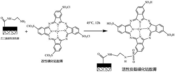 活性炭本身的孔隙結(jié)構(gòu)發(fā)達(dá),擁有大的比表面積和高吸收率與穩(wěn)定性。然而,活性炭按平常的方法浸漬磺化酞菁鈷催化劑會(huì)存在負(fù)載型催化劑的活性成分損失的問題,導(dǎo)致再利用性能不令人滿意。因此,應(yīng)通過化學(xué)接枝方法在活性炭上載入CoPcS。