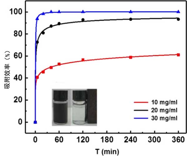 圖1.不同量的活性炭[10mg(紅線)20mg(黑線)30mg(藍(lán)線)]對(duì)DBT的吸附效率。