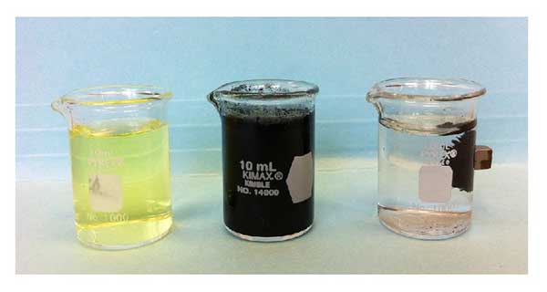 圖3吸附實(shí)驗(yàn)從左至右:檸檬黃的溶解,酒石黃與活性炭的混合物和磁性載體分離。