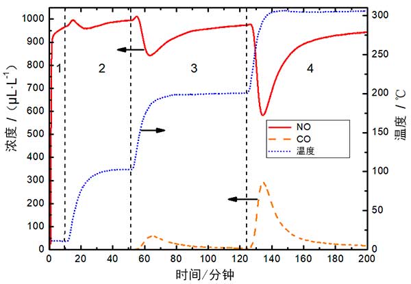 在加熱過程中,由于吸附的NO的部分解吸,出口NO將略微增加。然而,隨著溫度的升高,活性炭的化學吸附能力增加,化學吸附吸收更多的NO。因此,出口NO減少。當溫度保持恒定時,活性炭表面上的吸附活化位點隨時間逐漸降低,導致出口處NO濃度增加。然而,隨著溫度從15℃逐漸升高到300℃,活性炭的催化能力增加,脫硝效率也增加。