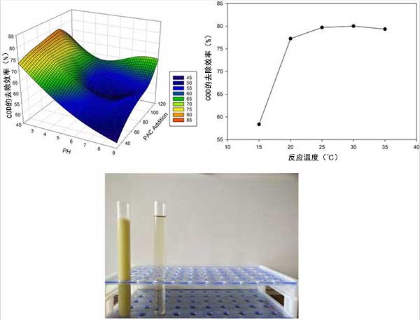 圖2:(a)不同濃度的活性炭對(duì)COD去除率的影響的響應(yīng)面,(b)反應(yīng)溫度對(duì)COD去除率的影響,(c)絮凝前后水樣的比較。