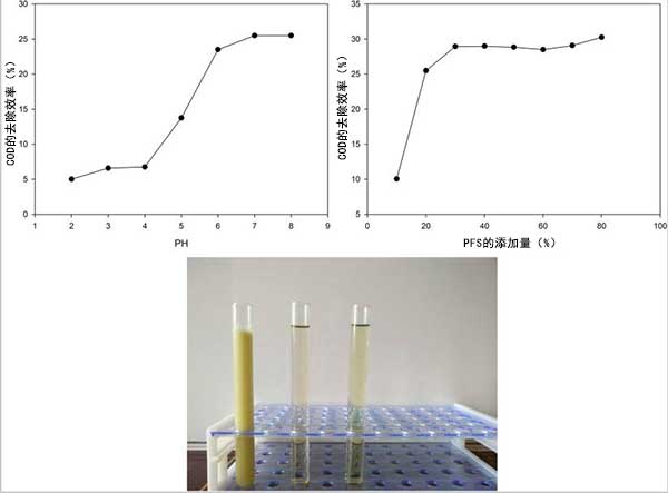 圖3:(a)pH對(duì)COD去除速率的影響,(b)PFS添加對(duì)去除COD的影響,(c)原始溶液與初級(jí)和次級(jí)絮凝后的溶液之間的視覺(jué)比較。