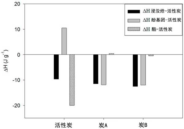 為了確定酯基在吸附質(zhì)-吸附劑相互作用中的貢獻(xiàn),從對(duì)羥基苯甲酸甲酯-活性炭和苯酚-活性炭的相互作用焓開(kāi)始計(jì)算相互作用的焓酯-活性炭。對(duì)于該計(jì)算,假設(shè)焓是分子的加成組成性質(zhì),因此對(duì)羥基苯甲酸甲酯-活性炭的相互作用焓對(duì)應(yīng)于苯酚和酯與活性炭相互作用焓的總和。圖4中顯示了對(duì)羥基苯甲酸甲酯-活性炭,苯酚-活性炭和酯基團(tuán)在水中吸附物-吸附劑的相互作用中的貢獻(xiàn)。