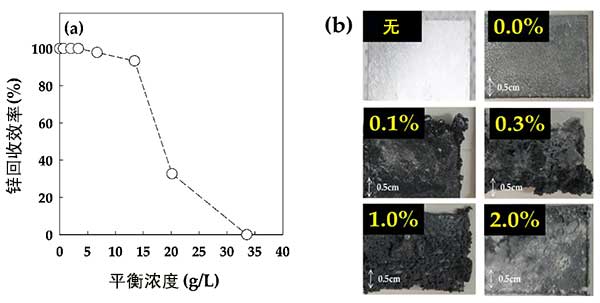 如圖4所示,在吸附物濃度為0.00-0.50%存在下的鋅回收效率至少恢復(fù)99.9%。在超過0.50%的吸附物存在下,鋅回收效率趨于迅速降低。一個(gè)電極的表面由具有不同吸附內(nèi)容物的電解質(zhì)中回收,在沒有吸附物的情況下,電極表面顯示出均勻的沉積。然而,對(duì)于0.1-2%的吸附物,電極表面看起來非常不均勻地生長。向電解質(zhì)中添加有機(jī)物改變了金屬沉積物的特征。從顯微鏡分析中,向電解質(zhì)中添加有機(jī)物導(dǎo)致在沉積表面上形成孔。因此,吸附物的存在降低了鋅的回收效率并導(dǎo)致不均勻的沉積。因此,去除吸附物必須小于0.1%。