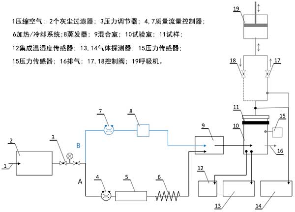 使用環(huán)己烷蒸氣作為被吸附物質(zhì)在圖2中所示的試驗(yàn)臺(tái)上進(jìn)行突破性實(shí)驗(yàn)。選擇環(huán)己烷進(jìn)行實(shí)驗(yàn),因?yàn)樗菧y(cè)試標(biāo)準(zhǔn)中特性比較全面的。此外,測(cè)試設(shè)置如圖2所示由于這種情況,優(yōu)化了使用環(huán)己烷作為測(cè)試物質(zhì)。環(huán)己烷是這類(lèi)物質(zhì)的良好代表,因?yàn)樗欠菢O性和非反應(yīng)性的,因此應(yīng)主要通過(guò)物理吸附與活性炭表面結(jié)合。此外,它是在工業(yè)過(guò)程中大量使用的化合物之一,因此它經(jīng)常存在于工作環(huán)境中。