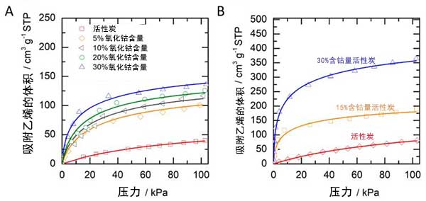測試氧化鈷浸漬的活性炭的性能以進(jìn)行乙烯吸附。圖2A顯示在具有和不具有0-101kPa壓力范圍的氧化鈷活性炭中的乙烯吸附等溫線。吸附乙烯的體積定義為標(biāo)準(zhǔn)溫度和壓力下的體積。通常,可以看出乙烯吸收隨著壓力的增加而增加。大量乙烯吸附至40kPa壓力。當(dāng)將壓力增加到40kPa以上時(shí),所有樣品可以進(jìn)一步吸附少量乙烯(添加10%-25%)。氧化鈷浸漬的活性炭是無負(fù)載的活性炭兩倍的乙烯吸附量,它清楚地表明氧化鈷在增強(qiáng)活性炭對乙烯吸附方面效果比較好。增加氧化鈷的含量進(jìn)一步增加了乙烯在氧化鈷浸漬的活性炭上的吸附能力。當(dāng)使用30%氧化鈷時(shí)能達(dá)到較高吸附容量。