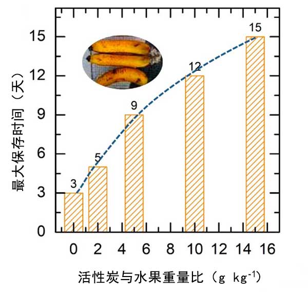 為了研究活性炭用量的影響,改變了活性炭和水果的質(zhì)量比。圖4顯示了活性炭與水果的保存時(shí)間與質(zhì)量比的范圍為;钚蕴康牧繒绊懕Y|(zhì)期,并且可以看到非線性相關(guān)性(見圖4中的虛線)。沒有活性炭達(dá)到存在,水果儲存時(shí)間僅為3天。根據(jù)添加的活性炭的質(zhì)量,保質(zhì)期可以從2天延長至12天。通過添加15克吸附劑用于1千克水果,可以實(shí)現(xiàn)延長高達(dá)5倍的保質(zhì)期。較高質(zhì)量的活性炭提供較長的保存時(shí)間,這可能是由乙烯吸附的活性位點(diǎn)含量較高引起的。結(jié)果表明,氧化鈷浸漬的活性炭有望用于延長水果的保質(zhì)期。