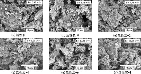 載鐵活性炭的SEM照片如圖1所示。載鐵活性炭具有片狀石墨填充結(jié)構(gòu)的表面形態(tài),其顯示產(chǎn)生大量微孔。對于所有活性炭,觀察到小的聚集體,其看起來更亮并且在活性炭的較暗表面上得到支撐。細(xì)氧化鐵顆粒傾向于覆蓋活性炭的表面而不是均勻地分散在整個表面上。作為四氧化三鐵的添加量增加,活性炭表面的聚集增加。通過能量分散X射線(EDX)分析(未顯示),證實聚集體是含鐵化合物。樣品的鐵含量顯示在圖1中每張圖的右上角。