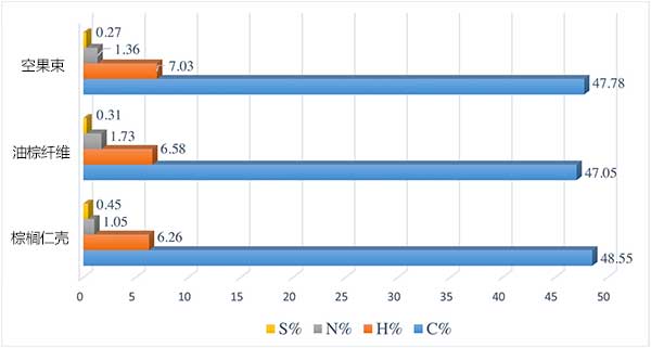 CHNS分析:在碳化和活化之前分析預(yù)處理活性炭的元素組成。圖4顯示了預(yù)處理樣品的定量元素分析的圖示。碳是所有樣品中最突出的元素,棕櫚仁殼,空果束和油棕纖維分別為48.55%,47.78%和47.05%?展7.03%的氫和1.36%的氮。油棕纖維含有6.58%的氫,1.73%的氮,而棕櫚仁殼含有6.26%的氫和1.05%的氮。對(duì)于所有活性炭樣品,硫含量不太重要,因?yàn)樗鼈兒康陀?%。