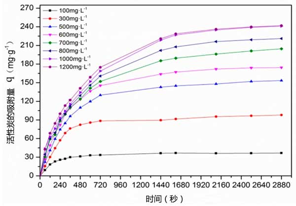 初始鉻黑T濃度對活性炭吸附的影響:用一系列鉻黑T水溶液(濃度:100.0-1200.0mg·L-1,體積:50mL)進(jìn)行初始鉻黑T濃度效應(yīng)實(shí)驗(yàn)。將溶液的pH調(diào)節(jié)至合適,然后將溶液加入3.00g·L-1活性炭中,并將混合物在25℃的溫度下在振蕩器上平衡48小時(shí),定期取水樣,測量鉻黑T水溶液的濃度,并計(jì)算吸附的鉻黑T量。