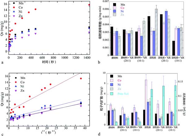 進(jìn)行動(dòng)力學(xué)和等溫線研究以測(cè)量這些活性炭用于從焦化廢水中吸附重金屬的可能性。動(dòng)力學(xué)數(shù)據(jù)顯示快速初始攝取,然后漸近接近平衡,在24小時(shí)內(nèi)達(dá)到(圖3a中的示例動(dòng)力學(xué)數(shù)據(jù))。應(yīng)用偽一階,偽二階和顆粒內(nèi)擴(kuò)散模型以擬合動(dòng)力學(xué)數(shù)據(jù)。在所研究的三種動(dòng)力學(xué)模型中,偽二階模型最好地描述了具有顯著更高相關(guān)系數(shù)的實(shí)驗(yàn)數(shù)據(jù)(所有重金屬/活性炭的R 2 > 0.98)比其他兩個(gè)型號(hào)高。圖3b顯示了吸附到每個(gè)焦炭樣品的每種金屬的假二級(jí)速率常數(shù)。