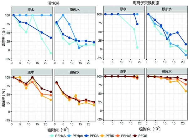 實驗總計進行了12周,每兩周取樣。這導(dǎo)致所有活性炭色譜柱的實驗運行時間為24個,分別處理原水和膜廢水的陰離子交換樹脂色譜柱。在每次采樣之后每周對所有柱進行反洗,以模擬典型的全尺寸操作?偣卜治隽15種全氟烷基物質(zhì),將吸附材料相對于全氟烷基物質(zhì)去除的性能與柱吸附模型的性能進行了比較。