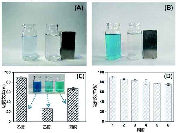 圖3:未加標(biāo)(A)和加標(biāo)(B)孔雀石綠廢水中活性炭吸附性能的照片,解吸溶液(C)的影響和活性炭的可重復(fù)使用性(D)。