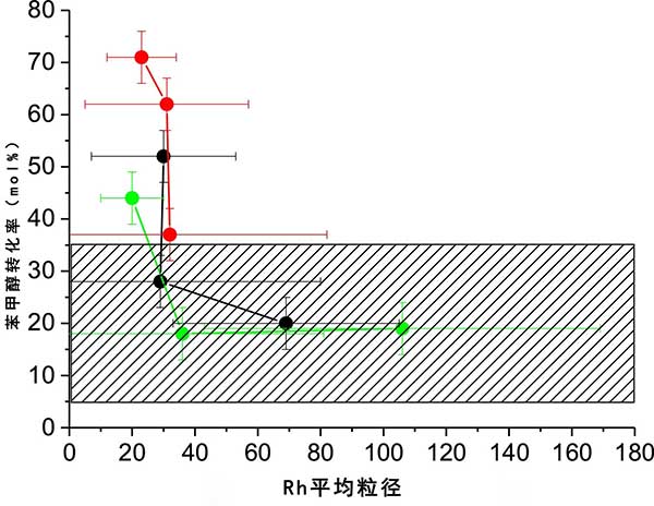 很明顯,這些粒徑范圍非常寬,我們認(rèn)為考慮這樣的大顆粒對(duì)氧化反應(yīng)具有活性是不現(xiàn)實(shí)的。在其它術(shù)語(yǔ)中,因子或參數(shù)是該預(yù)治療效果有在銠粒子的大小,但另外一個(gè)因素或參數(shù)是在銠粒徑變動(dòng)的影響對(duì)催化活性。圖3值得注意的是,對(duì)于高于約的顆粒。30-40nm不再觀(guān)察到與催化轉(zhuǎn)化的變化或相關(guān)性,表明粒度不再是活性參數(shù)。我們認(rèn)為該值是銠對(duì)芐醇氧化的活性的近似上限直徑,或者反過(guò)來(lái)對(duì)該反應(yīng)有活性要求小于約30納米。我們認(rèn)為這個(gè)結(jié)論雖然是一個(gè)廣泛的估計(jì),但與未來(lái)基于這種金屬的催化劑開(kāi)發(fā)相關(guān)。