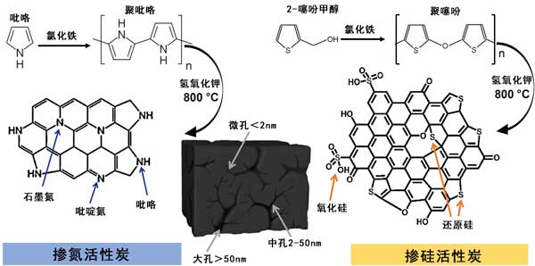 圖2:使用氫氧化鉀作為活化劑從聚吡咯和聚噻吩合成氮氣摻雜和硫摻雜的活性炭的示意圖。