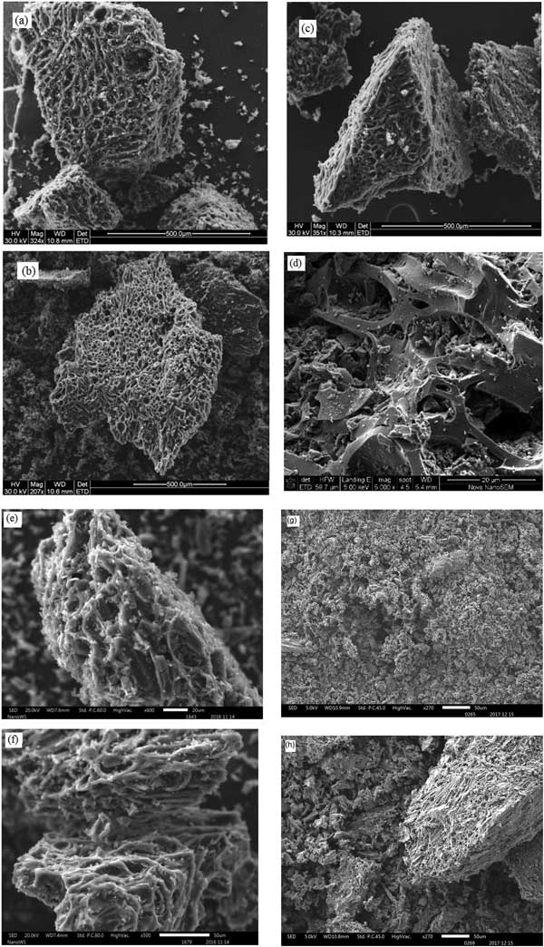 掃描電子顯微鏡圖像顯示在圖1a-h中。活性炭的磷酸處理導致具有可見孔隙率的材料(圖1a-c)。然而,仔細觀察后,孔隙結構和尺寸是不同的。20%濃度改性后的活性炭具有稍微細長的孔,40%表現出均勻的圓形孔,而60%顯示出細長和圓形毛孔的混合。這些觀察結果表明,不同濃度的磷酸活化的活性炭具有不同的物理屬性。在這種情況下,磷酸是活化劑,并且在加熱時產生孔道,因為它從碳中逸出,從而帶走一些萃取劑。圖1d描繪了具有小孔的粗糙紋理,圖1e顯示了類似巢的類型的孔,圖1f顯示了孔的破壞和變寬?捉Y構和孔體積的變化可歸因于活化劑的強度增加。濃度較高的硝酸會破壞表面基團。因此,需要使用最佳濃度的活化劑來防止損害吸附劑的表面特性。濃度太高可能導致結合官能團的提取,使吸附劑吸附性差。