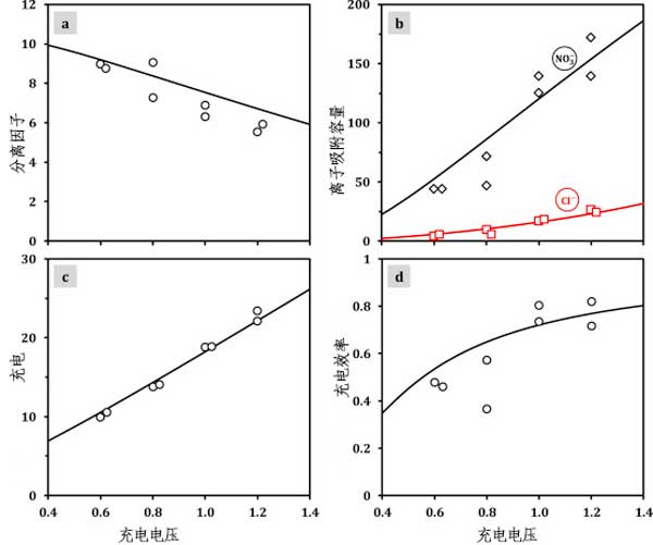 圖3a顯示了這一點(diǎn)分離因子隨充電電壓降低,但親和效應(yīng)不會(huì)減少很多,并且在高電壓下也繼續(xù)發(fā)揮重要作用。充電和離子吸附容量隨充電電壓的增加而增加。圖3d顯示充電效率遠(yuǎn)低于單位,這可以通過在充電步驟開始時(shí)從活性炭表面解吸共離子來解釋。