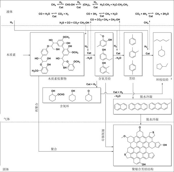 基于木質(zhì)素油的產(chǎn)物產(chǎn)率和組成,提出了一種用于加氫處理的反應(yīng)過程。木質(zhì)素使用活性炭催化劑和氫氣(圖3)。它涉及在液相和氣相中發(fā)生的許多連續(xù)和平行反應(yīng)。對(duì)低分子量烷基酚類和芳族化合物的所需反應(yīng)涉及通過裂解鍵來(lái)對(duì)木質(zhì)素進(jìn)行熱和催化解聚(加氫裂化)。最具反應(yīng)性的連接是醚鍵,盡管這些在木質(zhì)素中不是很豐富;钚蕴看呋瘎┐龠M(jìn)解聚反應(yīng),但在不存在活性炭催化劑的情況下的反應(yīng)也產(chǎn)生(有限)量的木質(zhì)素油,表明熱解聚反應(yīng)也起作用。低聚物片段可以進(jìn)一步解聚成烷基酚類形式的低分子量化合物或再聚合(也與已形成的低分子量化合物一起)成更高濃度的結(jié)構(gòu),最終導(dǎo)致燒焦。后一種途徑可能是熱反應(yīng),因此可以通過使用非;顫姷幕钚蕴看呋瘎﹣(lái)抑制,所述催化劑通過催化隨后的轉(zhuǎn)化來(lái)減少活性中間體的量。中間低分子量烷基酚類在反應(yīng)條件下不是惰性的,并且可以進(jìn)一步加氫脫氧成芳族化合物和烷烴。