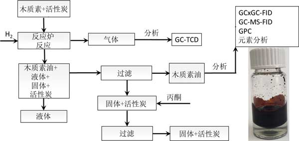 所有活性炭催化加氫處理反應(yīng)均在間歇式高壓釜中進(jìn)行。反應(yīng)器被鋁塊包圍,該鋁塊包含電加熱元件和允許冷卻水流動(dòng)的通道。使用氣體誘導(dǎo)的渦輪機(jī)機(jī)械攪拌反應(yīng)器內(nèi)容物。在線監(jiān)測(cè)反應(yīng)器中的溫度和壓力并記錄在電腦上。加氫處理和后處理程序示意性地顯示在圖1中。最初,向反應(yīng)器中加入木質(zhì)素和活性炭催化劑。隨后,用氫氣沖洗反應(yīng)器以排出空氣并在室溫下加壓至120巴以進(jìn)行泄漏測(cè)試。泄漏測(cè)試后,壓力降至100巴。開始攪拌(1200rpm),并以約10℃每分鐘的加熱速率將反應(yīng)器內(nèi)容物加熱至所需溫度(400-500℃)。當(dāng)達(dá)到所需溫度時(shí),將反應(yīng)時(shí)間設(shè)定為零。反應(yīng)完成后,將反應(yīng)器以約10℃每分鐘的速率冷卻至室溫。記錄室溫下的壓力以確定反應(yīng)過程中產(chǎn)生的氣相組分的量。將產(chǎn)生的氣體收集在氣袋中以確定組成。對(duì)于所有反應(yīng),觀察到兩個(gè)單獨(dú)的液相的清晰形成即即。產(chǎn)品處理程序如圖1所示。反應(yīng)后,將有機(jī)相和水相通過微過濾器過濾并通過傾析分離。用丙酮徹底洗滌固體并干燥以確定固體產(chǎn)率。