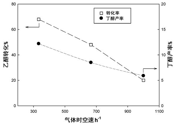 通過改變反應(yīng)器中的活性炭負(fù)載量,同時(shí)保持總流速和入口乙醇濃度不變,在400°C下初步研究了氣體時(shí)空速度對(duì)20%活性炭負(fù)載氧化鎂樣品的影響。結(jié)果以乙醇轉(zhuǎn)化率和丁醇產(chǎn)率報(bào)告于圖3。正如預(yù)期的那樣,乙醇轉(zhuǎn)化率通過降低氣體時(shí)空速度而增加。值得注意的是,對(duì)于較低的氣體時(shí)空速度值,制得丁醇的產(chǎn)率也增加。應(yīng)該注意的是,在我們的實(shí)驗(yàn)中負(fù)載的最大催化劑量(1克)對(duì)應(yīng)于約3厘米的催化床高度。更長的催化劑床層將超過電爐的等溫區(qū),因此,未探索出較低的氣體時(shí)空速度值。另一方面,即使使用較大可能劑量的催化劑,在350°C下進(jìn)行測試所得到的丁醇產(chǎn)量也可忽略不計(jì)。