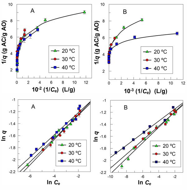 在不同的活性炭量下,評估了溫度(T=20–40°C)對沒食子酸和沒食子酸丙酯吸附過程的影響。實(shí)驗(yàn)吸附平衡數(shù)據(jù)擬合到兩個(gè)等溫線模型,Langmuir和Freundlich方程,并評估了擬合優(yōu)度。圖2。在研究的交流范圍內(nèi)獲得了非線性圖。因此,結(jié)果表明該模型不適用于描述沒食子酸和沒食子酸丙酯在活性炭上的吸附。注意,在任何給定的活性炭質(zhì)量下,溫度的變化都會(huì)導(dǎo)致沒食子酸和沒食子酸丙酯的吸附能力發(fā)生非常小的變化,差異小于2%。