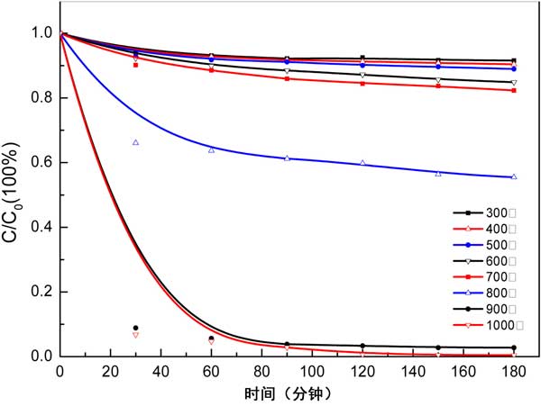 圖2:不同煅燒溫度下活性炭對的苯酚降解效率。