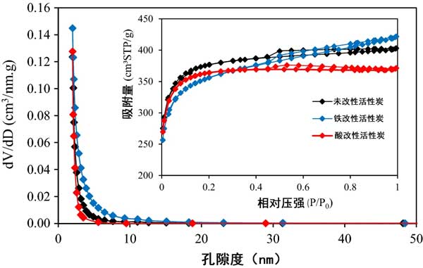 圖1顯示了活性炭纖維的孔徑分布。如圖1所示,活性炭纖維的孔徑在1至20nm之間。同時,幾種活性炭的所有氮吸附/解吸曲線均與IV型吸附等溫線相對應(yīng)。由于活性炭內(nèi)中孔定義為2–50 nm,在未經(jīng)改性和經(jīng)過改性的活性炭是微孔的,但HNO 3改性擴大了孔的結(jié)構(gòu)并導(dǎo)致了中孔的結(jié)構(gòu)。因此,活性炭顯示出微孔/中孔結(jié)構(gòu)特征,并且可以用作在水中吸附砷離子的有前途的材料。