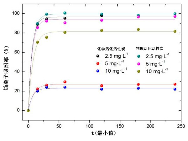吸附實驗表明,溶液pH的變化對活性炭的吸附有很大影響,在pH為4時獲得較大的吸附。如預(yù)期的那樣,溶液鏑濃度的降低會增加吸附百分比。另外,在化學(xué)活性炭的情況下,鏑吸收量隨著吸附劑量的增加而逐漸增加。在物理活性炭的情況下,沒有觀察到這種效果,其中除了使用的最低量外,吸附百分比實際上保持恒定。最后,溫度的變化稍微改善了吸附過程。盡管如此,物理活性炭在所有情況下都表現(xiàn)出很強的吸附能力。