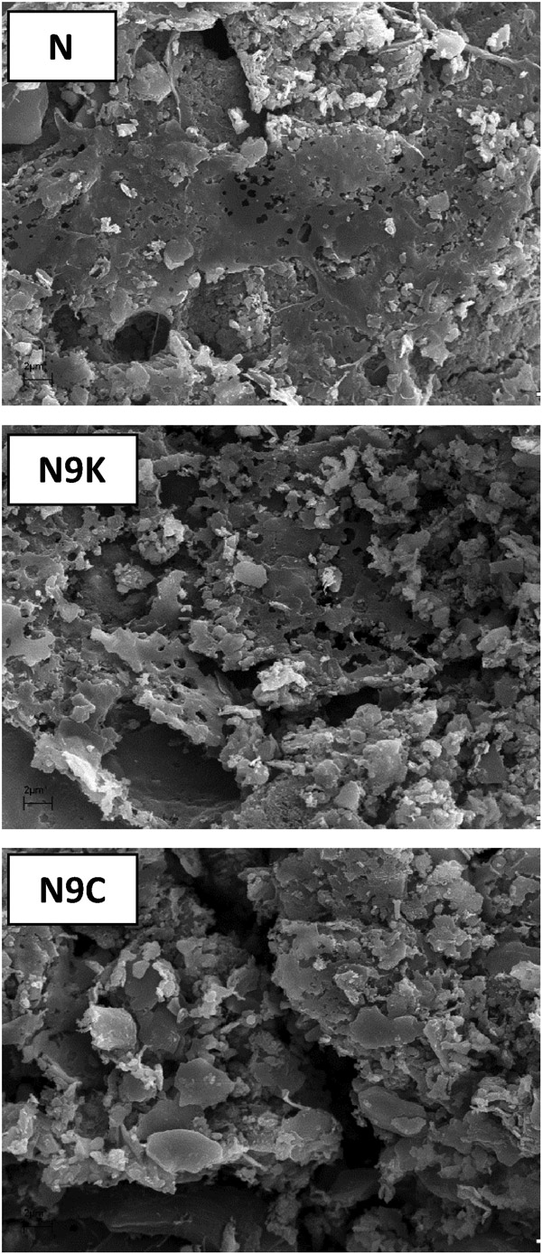 活性炭和經(jīng)改性后獲得的樣品的化學(xué)成分。兩種修飾均導(dǎo)致灰分含量以及結(jié)構(gòu)中特定元素的變化,其中這些變化對(duì)N9K樣品而言更大。起始活性炭(N)暴露于碳酸鉀會(huì)導(dǎo)致礦物質(zhì)(灰分)的顯著下降,同時(shí)氫含量下降兩倍(可能是碳結(jié)構(gòu)芳構(gòu)化的結(jié)果)由于活性炭顆粒的表面氧化,增加了氧氣量。還值得注意的是,灰分含量比在CO 2中退火的N9C樣品低了近10倍。大氣層。N9K中的灰分很可能是由于活化后將其用5%的鹽酸溶液洗滌而導(dǎo)致的。圖1所示的SEM圖像也證實(shí)了各個(gè)活性炭的質(zhì)地和形態(tài)多樣性?梢钥闯,根據(jù)制備程序,樣品在尺寸,形狀以及孔的數(shù)量或排列方面存在顯著差異。特別是在活性炭和N9C樣品中可以觀察到的較亮片段可能是其結(jié)構(gòu)中存在灰分(礦物質(zhì))的結(jié)果。