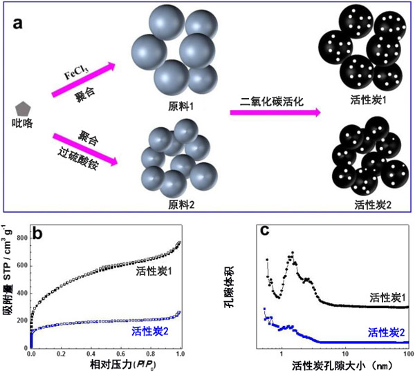圖1和一個(gè)示出了活性炭材料的制備方法。首先,使用不同的氧化劑(FeCl 3和過硫酸銨)通過吡咯單體的氧化聚合反應(yīng)合成了兩種樣品。其次,對(duì)原材料進(jìn)行二氧化碳活化處理,以制備具有高孔隙率的活性炭。進(jìn)行氮吸附測(cè)量以獲取關(guān)于他們的比表面積的數(shù)據(jù)。