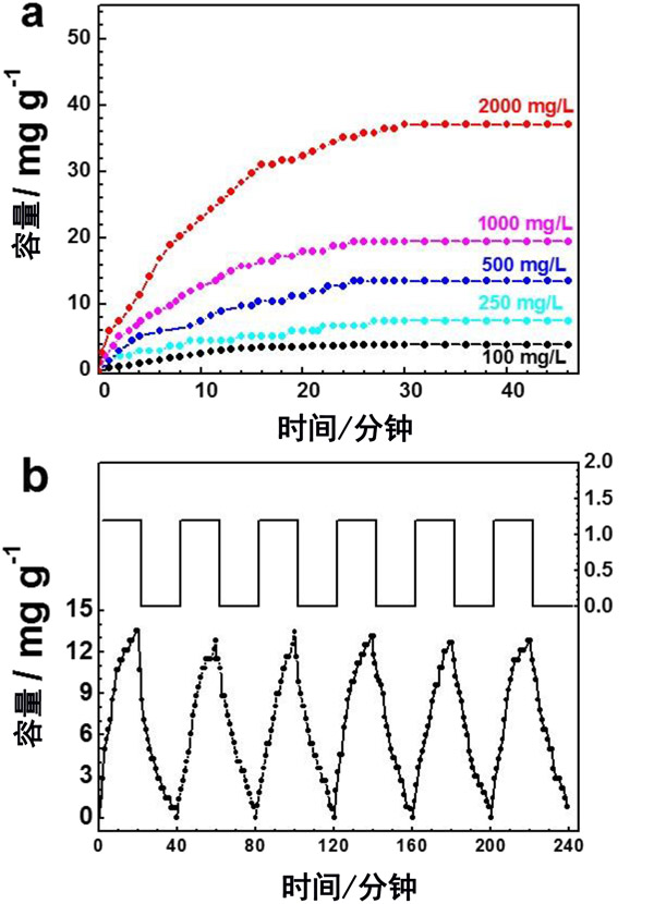 圖3:(a)在不同的NaCl濃度下活性炭的電吸附動(dòng)力學(xué),(b)活性炭電極在NaCl電解質(zhì)中的電吸附和再生循環(huán)。