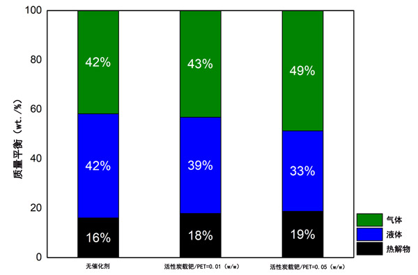 圖3:比較在800°C下有活性炭載鈀催化劑和沒有催化劑的情況下PET熱解的質量平衡。