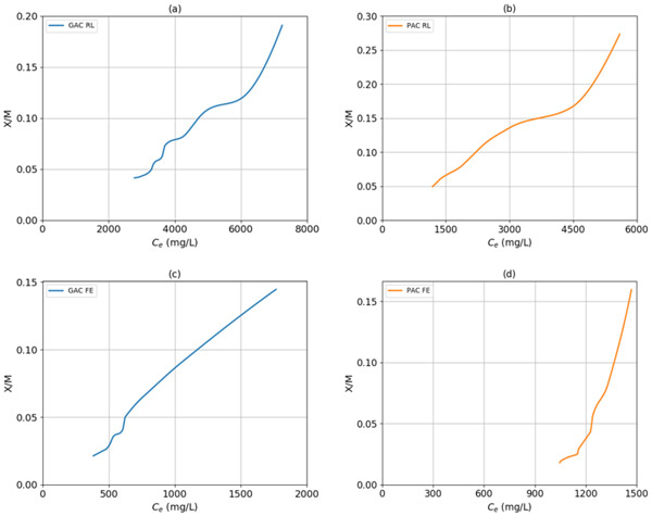 圖1顯示了顆;钚蕴颗c原浸出液,粉狀活性炭與原浸出液,粉狀活性炭與廢液以及粉狀活性炭與廢液的實(shí)驗等溫線。兩個樣品的曲線和兩個活性炭對應(yīng)于S形的等溫線(II型)的行為,因為曲線是凹向上,所以多層吸附進(jìn)行活性炭的表面上。利用該信息,就滲濾液而言,不管活性炭顆粒的性質(zhì)和大小如何,都可以假定吸附劑中殘留的化學(xué)需氧量是通過物理吸附發(fā)生的。