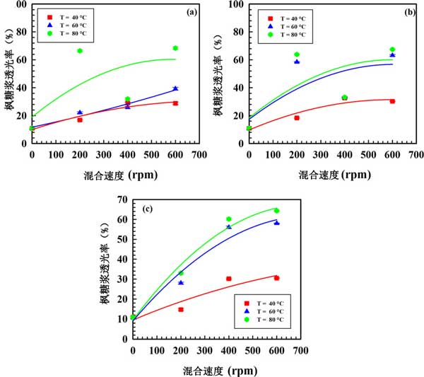 圖4:在固定工作溫度和活性炭粒徑下,透光率與混合速度的關(guān)系:(a)25μm,(b)50μm,(c)75μm。