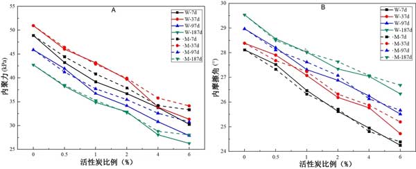 圖3:活性炭對(duì)植被混凝土的內(nèi)聚力(A)和內(nèi)摩擦角(B)的影響。