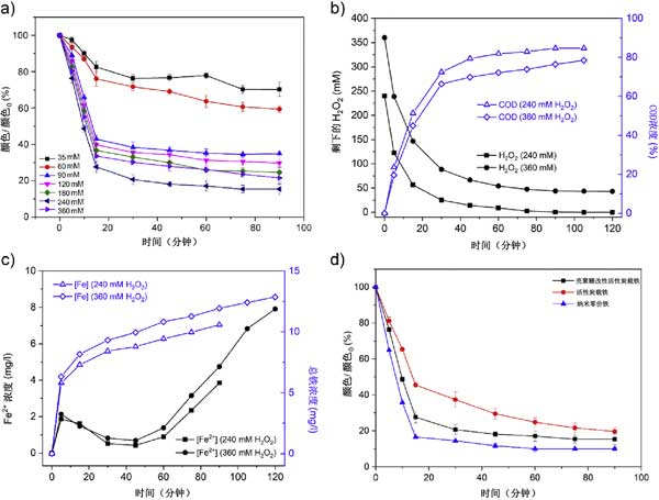 圖2:(a)活性炭處理的合成黑素廢水的脫色(C/C 0百分比),(b)在存在H2O的處理過(guò)程中,殘留H 2 O 2的濃度變化和活性炭的COD去除效率,(c)鐵離子的濃度變化和總鐵離子,(d)活性炭在相同載鐵量的條件下,三種催化劑在處理黑素廢水中的催化活性對(duì)脫色效果的比較。