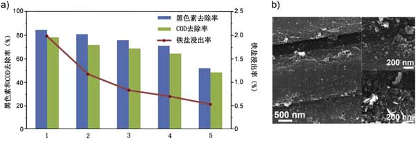 檢查了活性炭催化劑的可重復(fù)使用性,以評(píng)估其是否經(jīng)過(guò)了多個(gè)循環(huán)的黑色素處理。圖3顯示了五個(gè)處理周期的COD和脫色以及鐵浸出的結(jié)果。一個(gè)。盡管觀察到4個(gè)循環(huán)后,脫色效率從85%逐漸降低到70%,但是,可以證明活性炭催化劑在Fenton反應(yīng)中具有合理的可重復(fù)使用性。效率的降低可歸因于吸附降解副產(chǎn)物時(shí)某些催化劑位點(diǎn)的失活以及在Fenton反應(yīng)過(guò)程中少量鐵的浸出。在每個(gè)循環(huán)后對(duì)鐵的浸出進(jìn)行了研究,以表明活性炭的穩(wěn)定性。如圖3所示a,在第一個(gè)循環(huán)中浸出鐵離子的量最高,約為初始鐵量的2%。在第三個(gè)循環(huán)后,浸出鐵降至<1%,并且在隨后的循環(huán)中保持穩(wěn)定,在第五個(gè)循環(huán)時(shí)降至0.5%。與將鐵離子浸入溶液中的單獨(dú)的納米零價(jià)鐵相比,在Fenton類工藝中,亞鐵離子和鐵離子可能會(huì)被活性炭吸附/螯合,從而避免了浸出并使反應(yīng)連續(xù)供入。零碎的鐵損失顯然是活性炭催化劑再利用以及減少鐵淤渣的重要步驟。