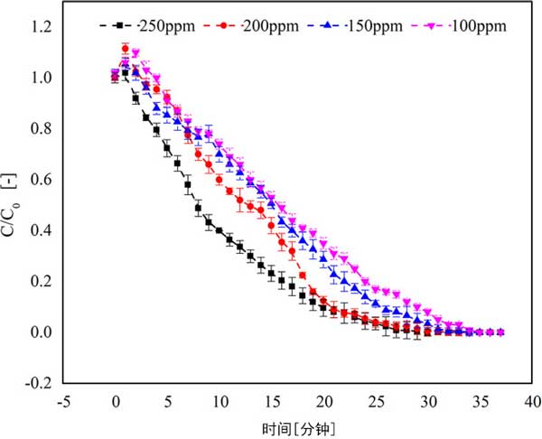 圖2:改變進(jìn)氣中三氯乙烯的初始濃度對(duì)活性炭吸附能力的影響。