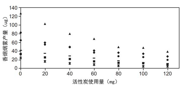測試過程中我們?cè)跓o炭和以20毫克至120毫克的六種重量增量添加活性炭來測試香煙。桿端和嘴端的醋酸纖維素長度段始終保持恒定。最大的空腔填充值用于所有負(fù)載,因此,總的過濾器長度增加了約50%。每使用15毫克活性炭增加1毫米。如前所述,所有香煙都在35/2/60的條件下進(jìn)行調(diào)理和抽煙。每個(gè)濾嘴負(fù)載量高為120mg時(shí)添加活性炭對(duì)焦油和尼古丁的收率(即顆粒相)的影響很小,這可能是由于較長的濾嘴導(dǎo)致了額外的機(jī)械過濾。對(duì)于所有測得的蒸氣,隨著活性炭載量的增加,產(chǎn)率都有所下降。這在圖1中以圖形方式顯示(僅出于清晰目的使用一定范圍的蒸氣),其中乙醛/丙酮值乘以0.1以進(jìn)行縮放。
