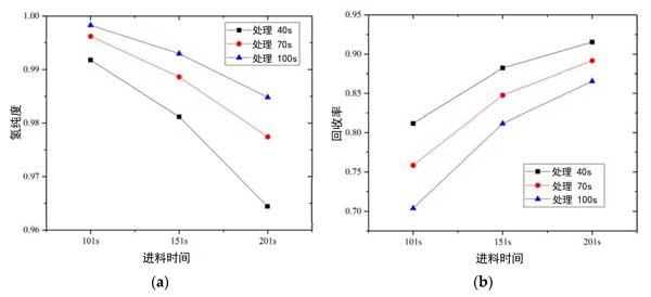 圖2:進料時間和吹掃時間對真空變壓吸附循環(huán)的氫純度(a)和回收率(b)的影響。