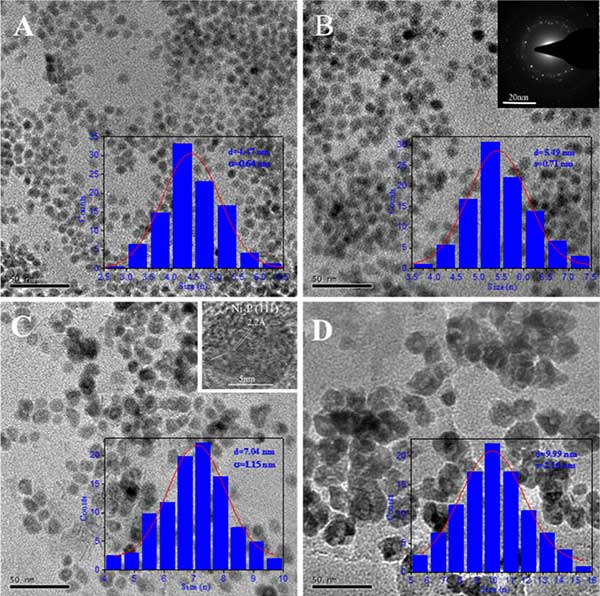 活性炭中鎳的透射電子顯微照片(圖1的A-d),納米粒子為球形且均勻地分布,這表明金屬磷化物納米顆粒的相對尺寸和分散度的化學(xué)反應(yīng)過程中合成。在催化劑合成過程中,油胺起還原劑的作用,從而控制成核速率。同時,三辛基膦用作磷源和穩(wěn)定劑,通過Ni(0)表面的配位提供可調(diào)的表面穩(wěn)定性。在合成中,對于少量三辛基膦,發(fā)生Ni(II)前體的快速還原,導(dǎo)致Ni(0)物質(zhì)的重要濃度,其不能被溶液中存在的配體有效穩(wěn)定。然后,快速聚集過程的結(jié)果形成大尺寸的磷化鎳納米顆粒在活性炭載鎳催化劑。然而,當(dāng)油胺的量減少時,制備少量核,并且大量三辛基膦的存在抑制它們的生長,導(dǎo)致形成小的納米顆粒。此外,所選擇的區(qū)域的電子衍射和晶格條紋的圖像(在所示圖1 B,C)表明,球形磷化鎳納米粒是單晶。因此,它的尺寸大于Ni 2通過改變油胺和三辛基膦的濃度可以很容易地調(diào)節(jié)活性炭催化劑,這提供了一種精確控制其尺寸在4到10nm范圍內(nèi)的方法,在這些方法中,這些磷化鎳納米顆粒在活性炭上以各種尺寸負(fù)載將具有不同的屬性可能導(dǎo)致不同的反應(yīng)性。