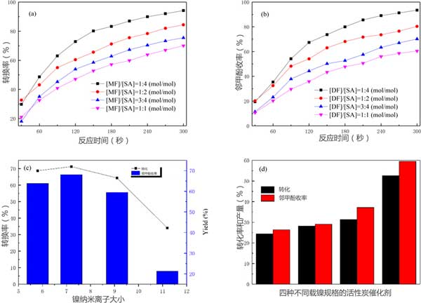 為了研究磷化鎳尺寸對活性炭催化性能的影響,SA的加氫脫氧在220℃和2MPa氫氣壓力下進行。在催化活性的顯著差異可以為鎳中觀察到活性炭變化的尺寸。隨著磷化鎳納米顆粒的減少,轉(zhuǎn)化率先增加然后減少。其中,活性炭在加氫脫氧反應(yīng)中表現(xiàn)出更高的反應(yīng)性,在180分鐘內(nèi)SA的轉(zhuǎn)化率達(dá)到99%以上,對鄰甲酚的收率超過97%。較小的鎳微晶表現(xiàn)出更強的Ni-P相互作用和磷在表面上的額外暴露,這顯著影響中間體的吸附狀態(tài),其中磷化鎳與反應(yīng)物之間的相互作用既不太弱也不太強。因此,可以通過使用不同納米顆粒尺寸的磷化鎳來控制SA的加氫脫氧活性。