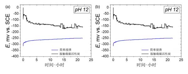 中性和堿性溶液中試樣的開路電位隨時(shí)間的變化如圖4所示。與銀浸漬活性炭接觸的樣品的開路電位在最初階段是高的,然后在中性和堿性溶液的實(shí)驗(yàn)開始時(shí)急劇下降。根據(jù)這些結(jié)果,認(rèn)為在實(shí)驗(yàn)開始時(shí)發(fā)生縫隙腐蝕,當(dāng)樣品與銀浸漬活性炭接觸時(shí)開路電位降低。結(jié)果表明“電化學(xué)效應(yīng)”是嚴(yán)重縫隙腐蝕的主要原因。